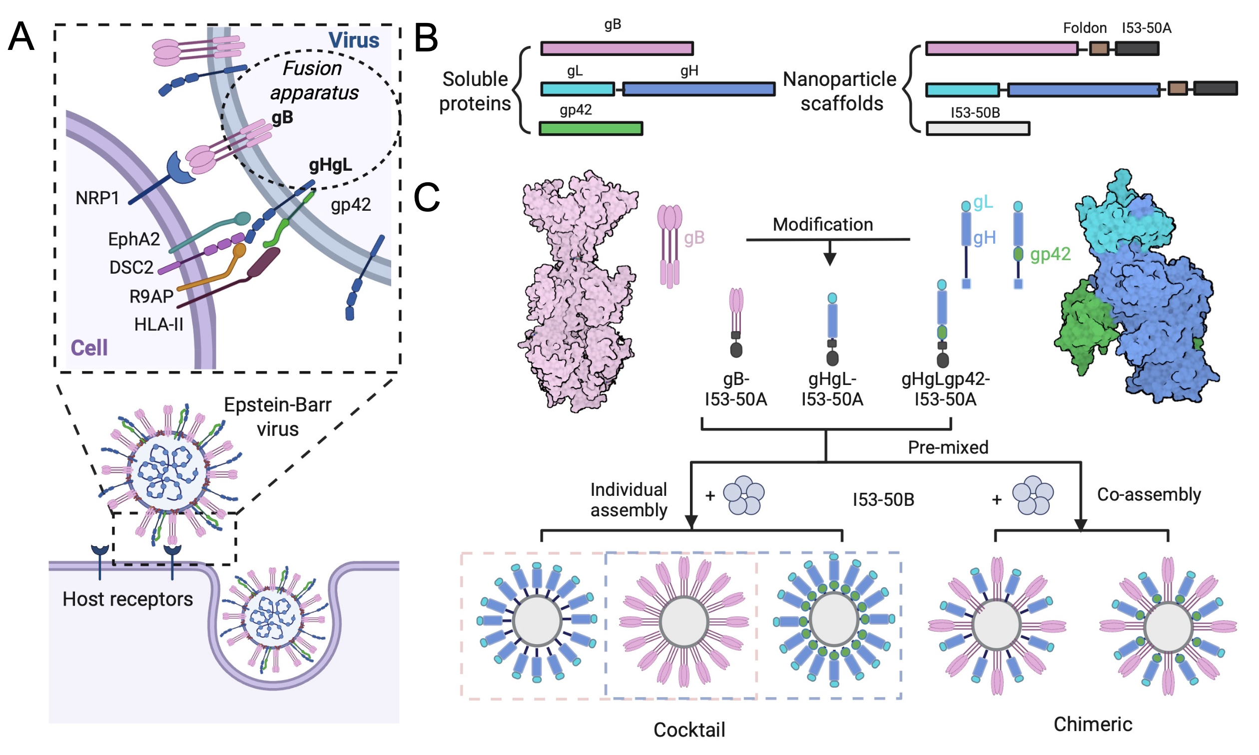 Epstein–Barr病毒(EB病毒,EBV)是一种广泛感染人群的致瘤疱疹病毒,与多种恶性肿瘤如鼻咽癌、淋巴瘤以及自身免疫性疾病如多发性硬化等密切相关,但迄今仍无获批疫苗或特效药物。EBV能感染上皮细胞、B细胞等多种细胞类型,其包膜糖蛋白gHgL与gB构成的融合装置协同介导受体识别与病毒-宿主细胞膜融合,对EBV侵染过程至关重要。前期研究表明,针对gB与gHgL的中和抗体可同时阻断上皮细胞与B细胞感染,提示其作为疫苗靶点的潜力。然而,EBV包膜糖蛋白在病毒颗粒中呈异质共展示特征,传统单抗原或混合疫苗难以完整模拟其天然构象与免疫特性。